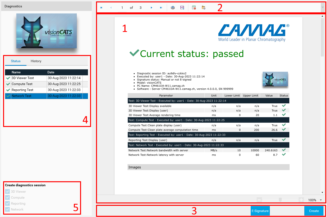 Action buttons (3) are available at the bottom to create, run or abort diagnostics, and to perform the E-Signature of diagnostics (see E-Signature).