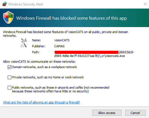 If Windows Firewall is activated, you will probably see the following warning. Indeed, the visionCATS installer tries to communicate with previous installations of visionCATS and, in case of a client installation, tries to contact the server installation. Please hit Allow access (or perform the modification manually in Windows Firewall) to configure your Windows Firewall accordingly: