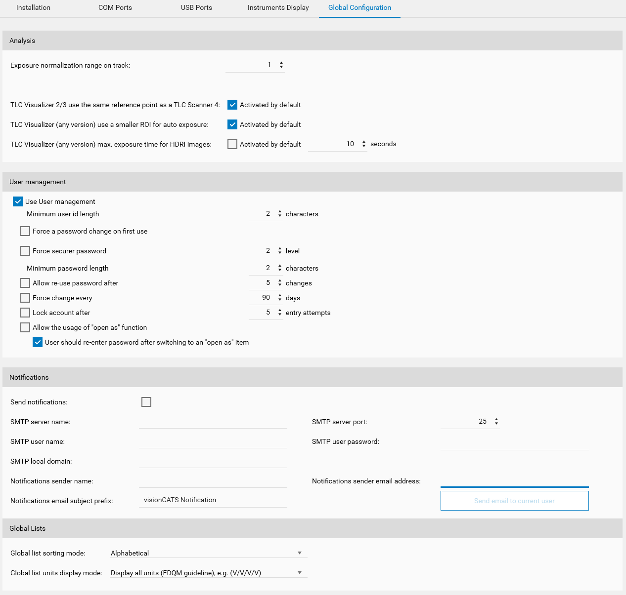This part allows to activate/deactivate the user management and to configure the associated options for the whole installation.