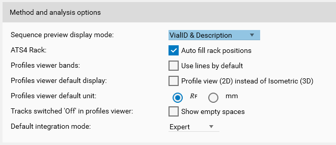 Profiles viewer default unit : in analysis (Profiles View, Integration), the Profiles viewer can display the X-Axis positions either in 𝑅ꜰ or millimeter unit. This parameter is not applicable to spectrum views (wavelength in nanometer) and to the Profile comparison (always displayed in 𝑅ꜰ unit because the physical position vary between plates).