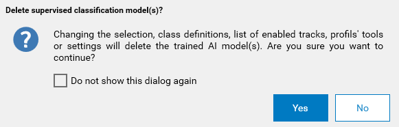 Changing the selection will impact the supervised classification results. If models have already been trained, a popup will appear, asking if you want to delete the existing models, or cancel the changes. If you choose to delete the models, you will need to retrain them after making changes in this view.