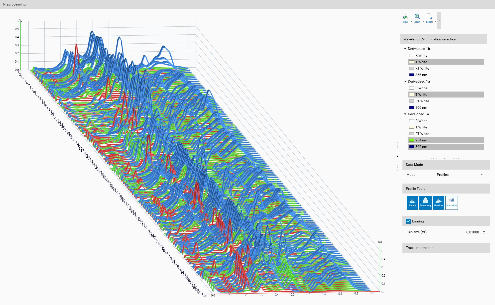 Depending on the selected Data Mode, export the profiles or the peaks of the selected wavelength/illumination and for all tracks of all samples in the comparison, with all configured preprocessing steps applied.