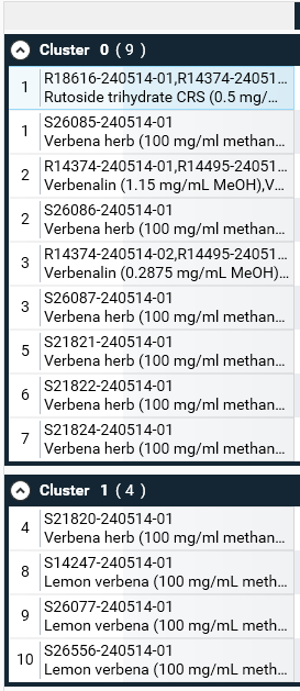 Each track will be assigned to a cluster group, with the cluster number in the group header. As clusters are identified without prior knowledge, the numbering of clusters is arbitrary and does not imply any order or ranking.