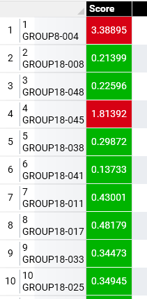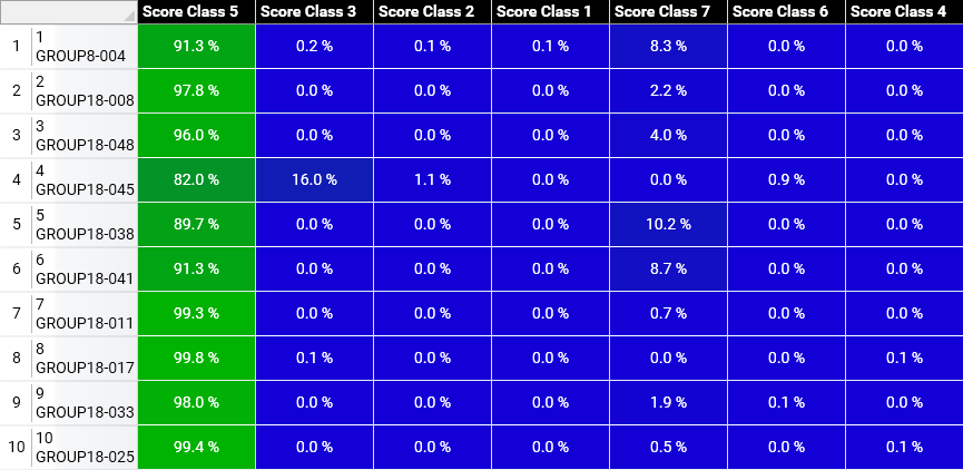 Each track will display the score of the one-class classification, which indicates how well the track fits into the defined class. Any value on the correct side of the threshold will be displayed in green, while values on the wrong side will be displayed in red.