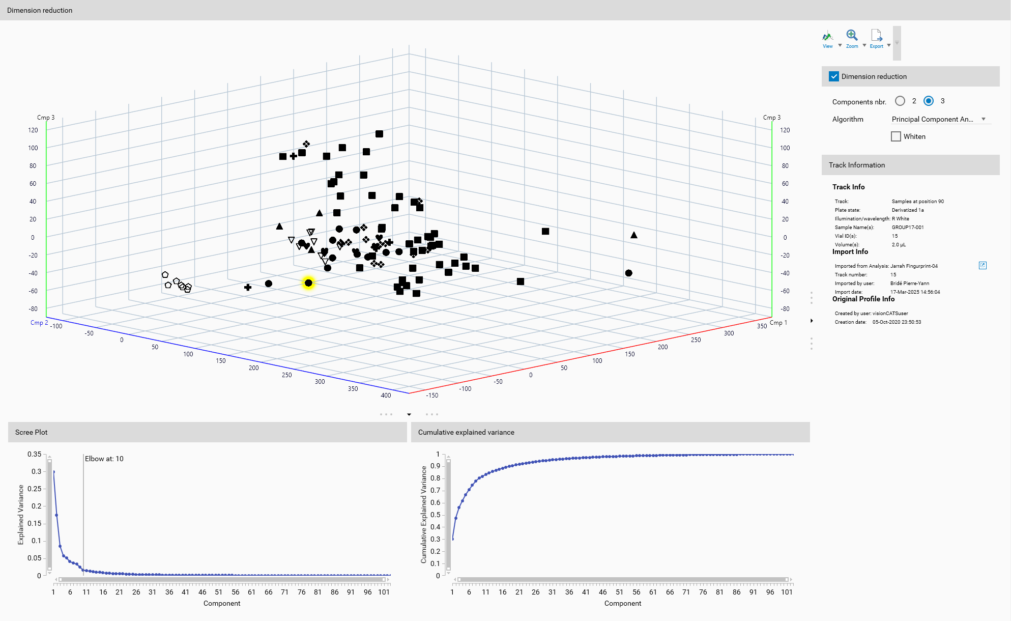 A 3D view is available to visualize the samples in the reduced space, either 2D or 3D depending on number of components selected. It will help to understand the effect of the dimension reduction algorithm on your data.