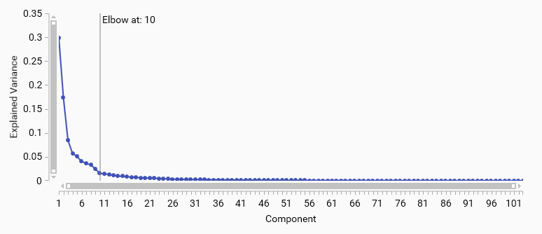 A PCA scree plot shows the variance explained by each principal component in descending order; the “elbow” is the point where the curve changes from steep to flat and indicates diminishing returns from additional components. Components up to the elbow typically capture the main signal.