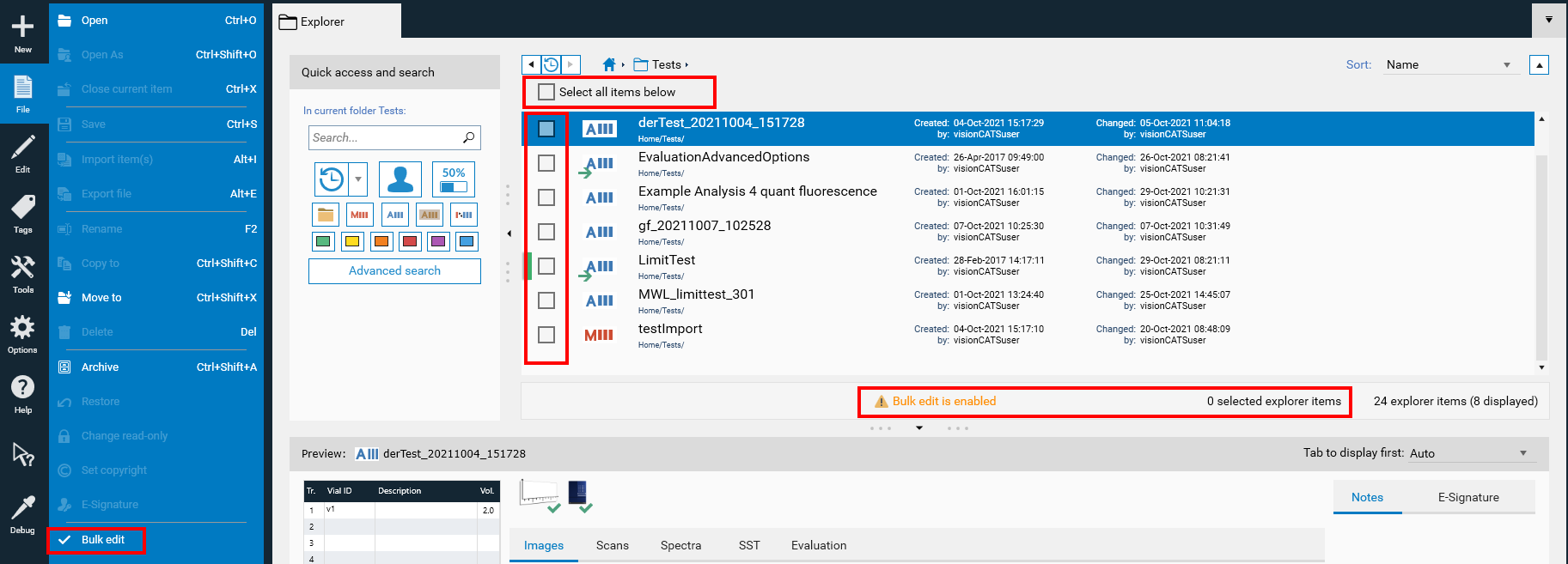 Bulk edit : the bulk editing mode allows to perform some operations on multiple explorer items at once. When the Bulk edit box is checked, the main explorer view slightly changes to display a selection check box for each item, as well as a Select all items below box. The status bar is adapted to give some feedback to the user concerning the current selection mode and items. visionCATS currently supports the following operations in Bulk edit mode: Move to, setting a category (see Menu Tags) Delete, Archive, and Restore.