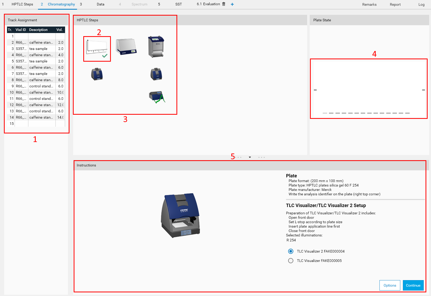 The actual HPTLC is carried out in the Chromatography tab. The following tasks are available in this view: