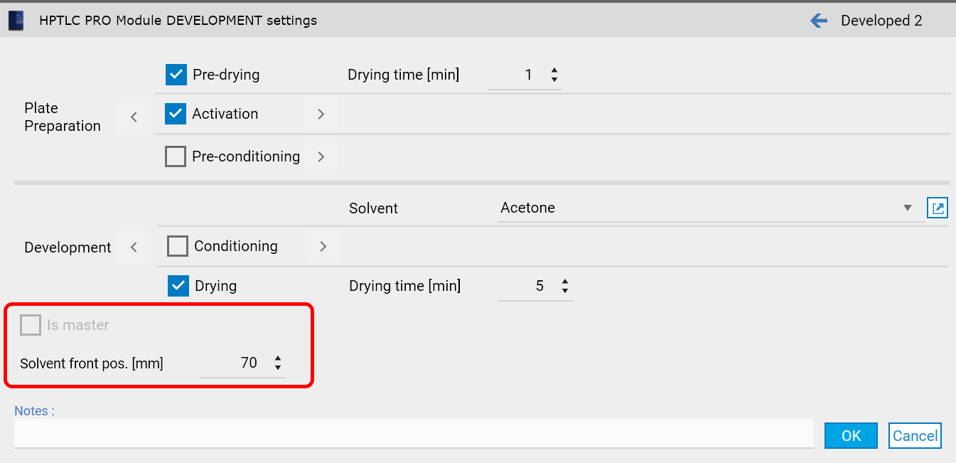 The other development steps are not Master and the solvent front position can be configured directly in the steps parameters: