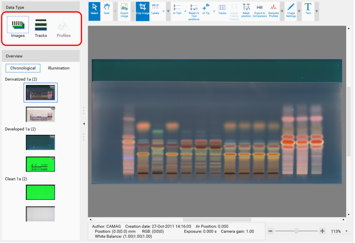 All images and scan data gathered through documentation (TLC Visualizer and TLC Scanner 4) steps can be reviewed and processed in the data tab.
