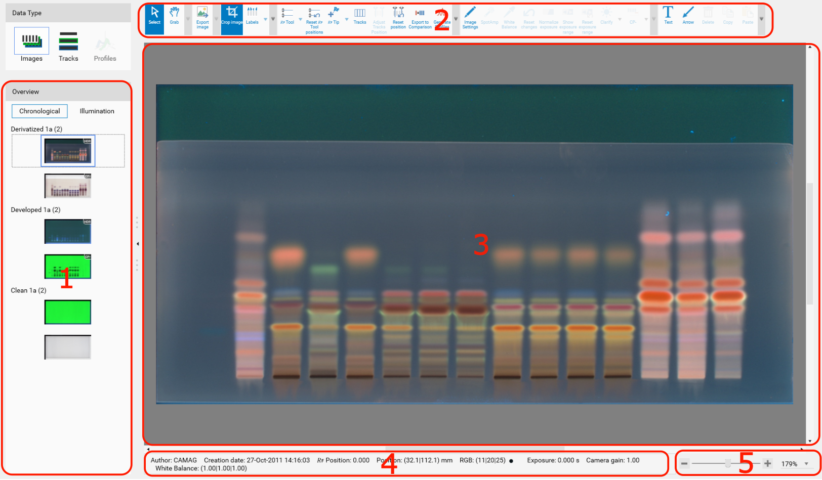 Some information about the current image is displayed here. Place the mouse pointer to a desired position on the image to see the corresponding 𝑅ꜰ/mm positions and color information.