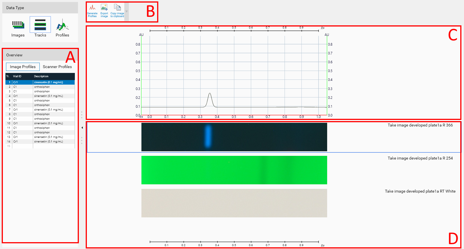 If the profiles has been generated from TLC Visualizer step images, then the (C) part is displayed.