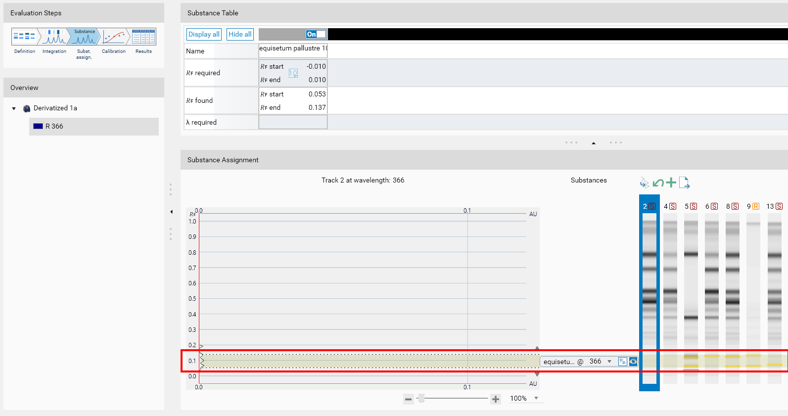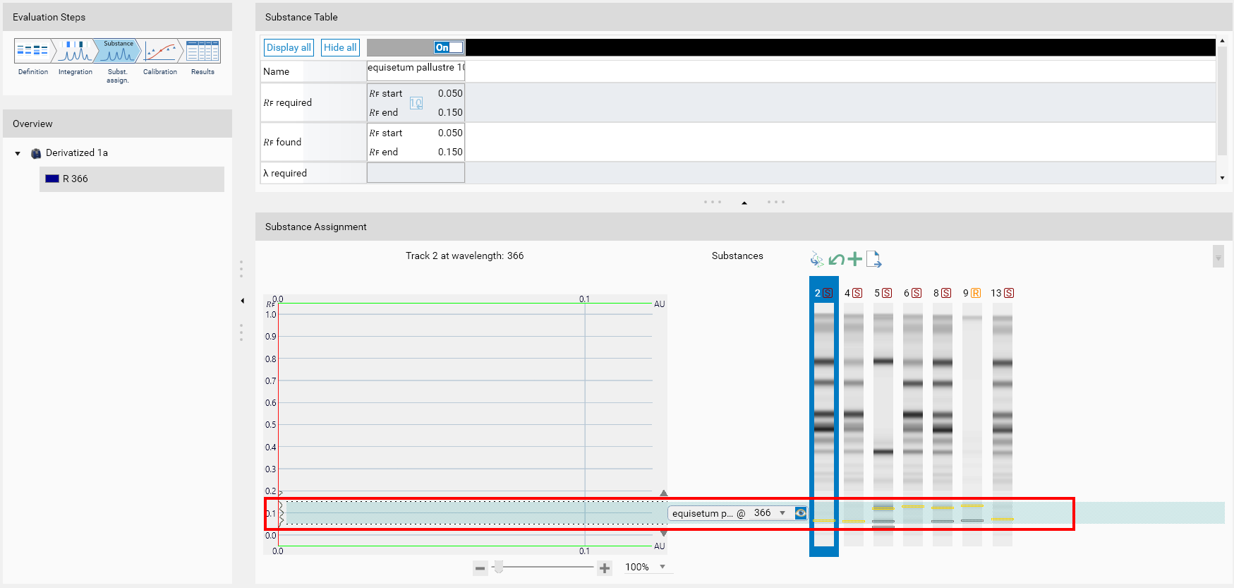 Range: in that case the substance is not assigned to peak(s) but directly to the 𝑅ꜰ range between 𝑅ꜰ start and 𝑅ꜰ end. It means that the area of the whole range is taken as calibration point value. Use this mode to evaluate the total content on a given 𝑅ꜰ range and/or when a set of convoluted peaks, which cannot be detected by the regular peak detection algorithms, have to be evaluate together.