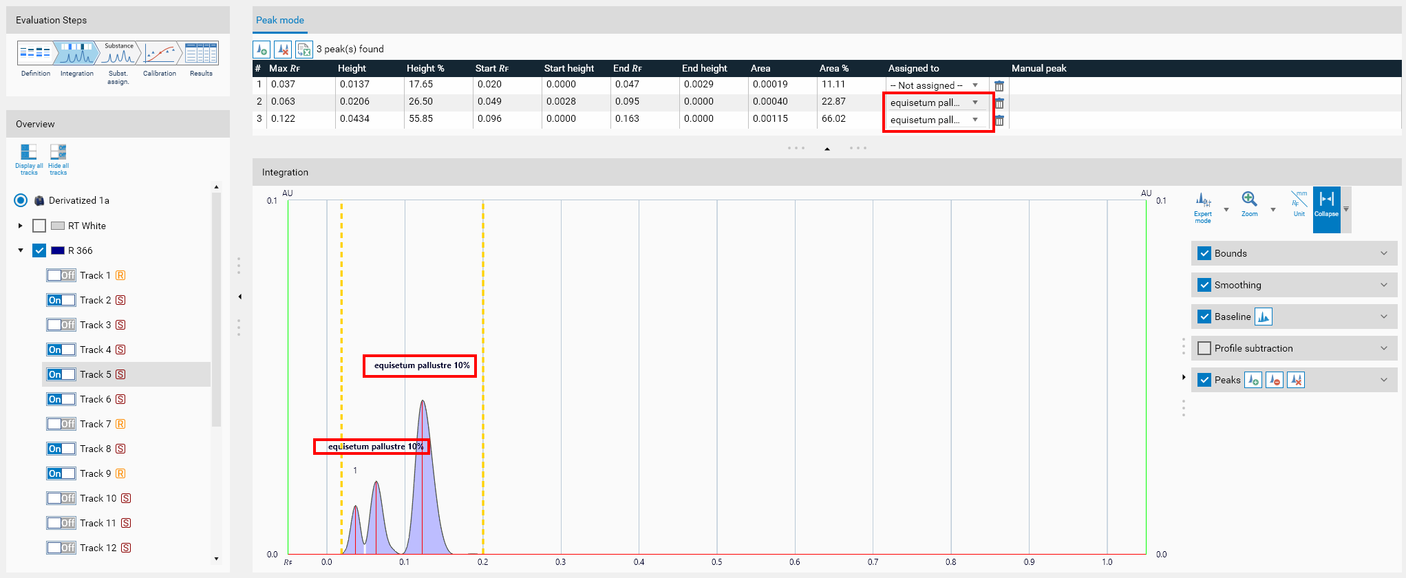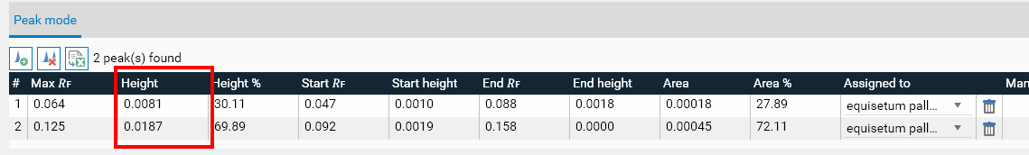 Single (default): the substance is assigned to 0 or 1 peak on each track, depending if a peak was found in the 𝑅ꜰ range defined (Δ𝑅ꜰ window around 𝑅ꜰ center). If several peaks exist in the 𝑅ꜰ range, only the biggest one is assigned to the substance. Then, depending on the calibration type, the height or the area of the peak is directly considered to compute the calibration point.