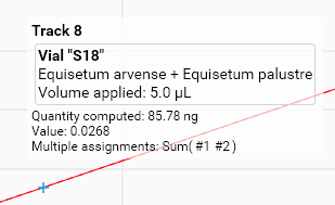 During the Calibration phase, visionCATS still computes one single calibration point for each track where the substance had assignments. The value considered is the sum of the corresponding peak values (height or area). In the following example, peaks 1 and 2 were assigned to the substance in track 8. The tooltip recalls the corresponding information: