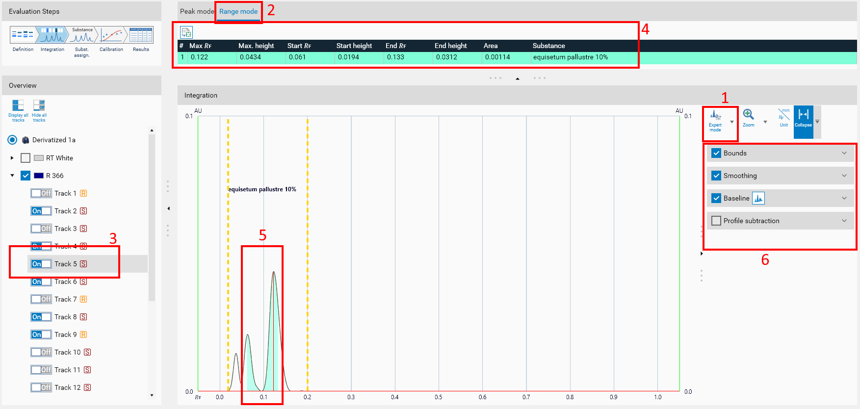 Provided that substances in Range assignment mode are not assigned to peaks, their display has been separated from the usual default display which is focused on peaks. Initially, ranges are not displayed at all. To display them, switch to the Expert mode (1) if this was not already done. Then, notice that when there are substances in Range assignment mode, the top panel has a second tab available named Range mode (2). Which clicking on it, the display is adapted, notably to remove the Peaks box on the right side tools (6) which makes no sense in this mode. To display ranges, click on a track (3). The ranges table is displayed (4) (with a button to export in CSV format) and the viewer displays ranges in a dedicated color (5):