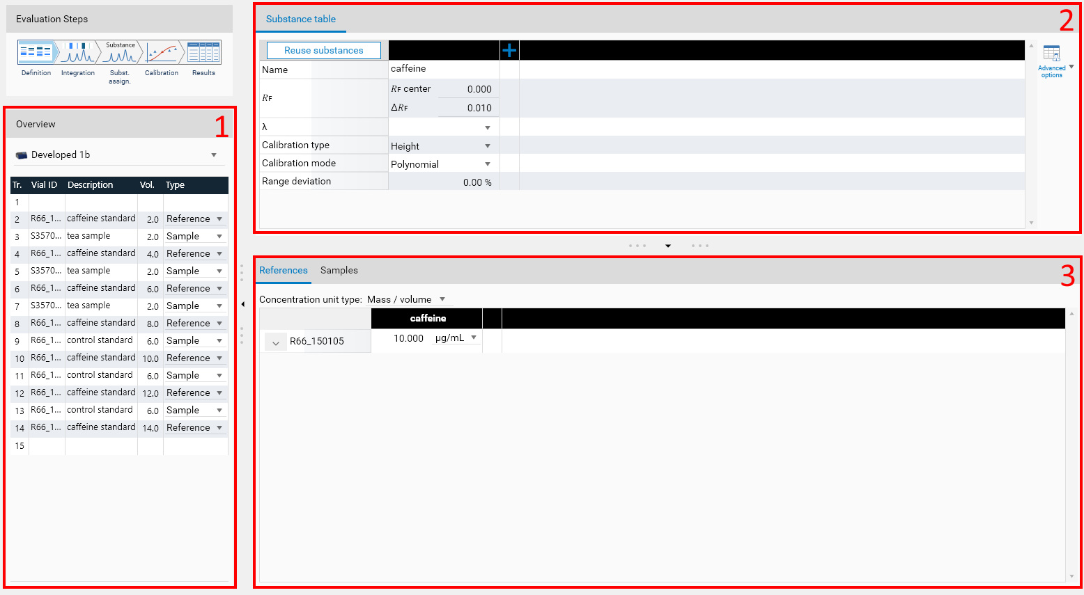 3: Configure the References concentration and purity and the Samples reference amounts for the evaluation