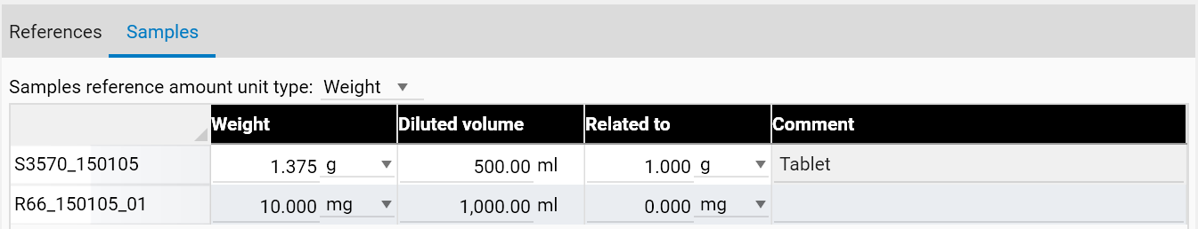 The amounts (first column and Related to column) can be defined in Weight (gram-based) or Volume (Liter-based) depending on the Sample reference amount unit type (independent of the Concentration unit type defined in References).