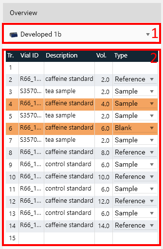 The Track Assignment already defines the sample tracks and the reference tracks for the current analysis, but it can happen that this configuration has to be modified for a given evaluation (for example to test different configurations in several evaluations). Use the combo box next to each track to configure individual vial applications. When you change the type of a vial application, the References and Samples sections of the current tab are modified accordingly, and the vial application is displayed with an orange background (e.g. tracks 4 and 6 in the previous screen capture) if the type is not the same as the one defined in the global Track Assignment.