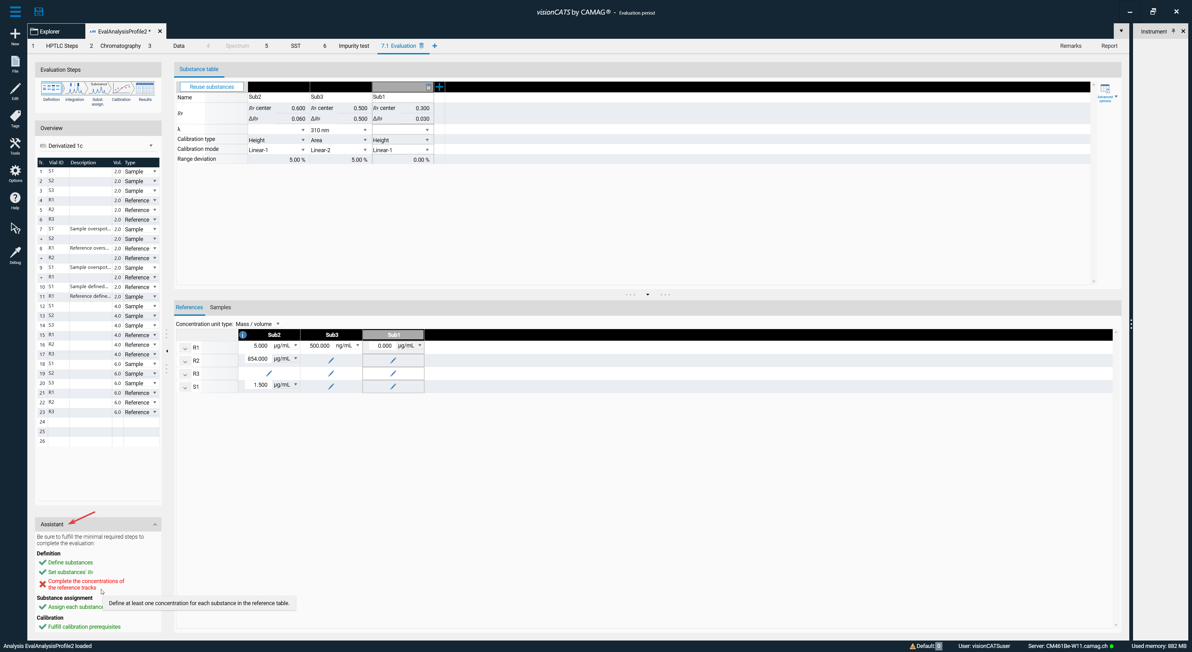 The evaluation assistant in the Evaluation tab guides the user through the steps necessary to calculate the calibration curve and obtain the results.