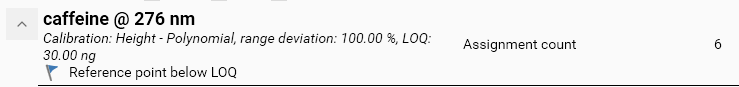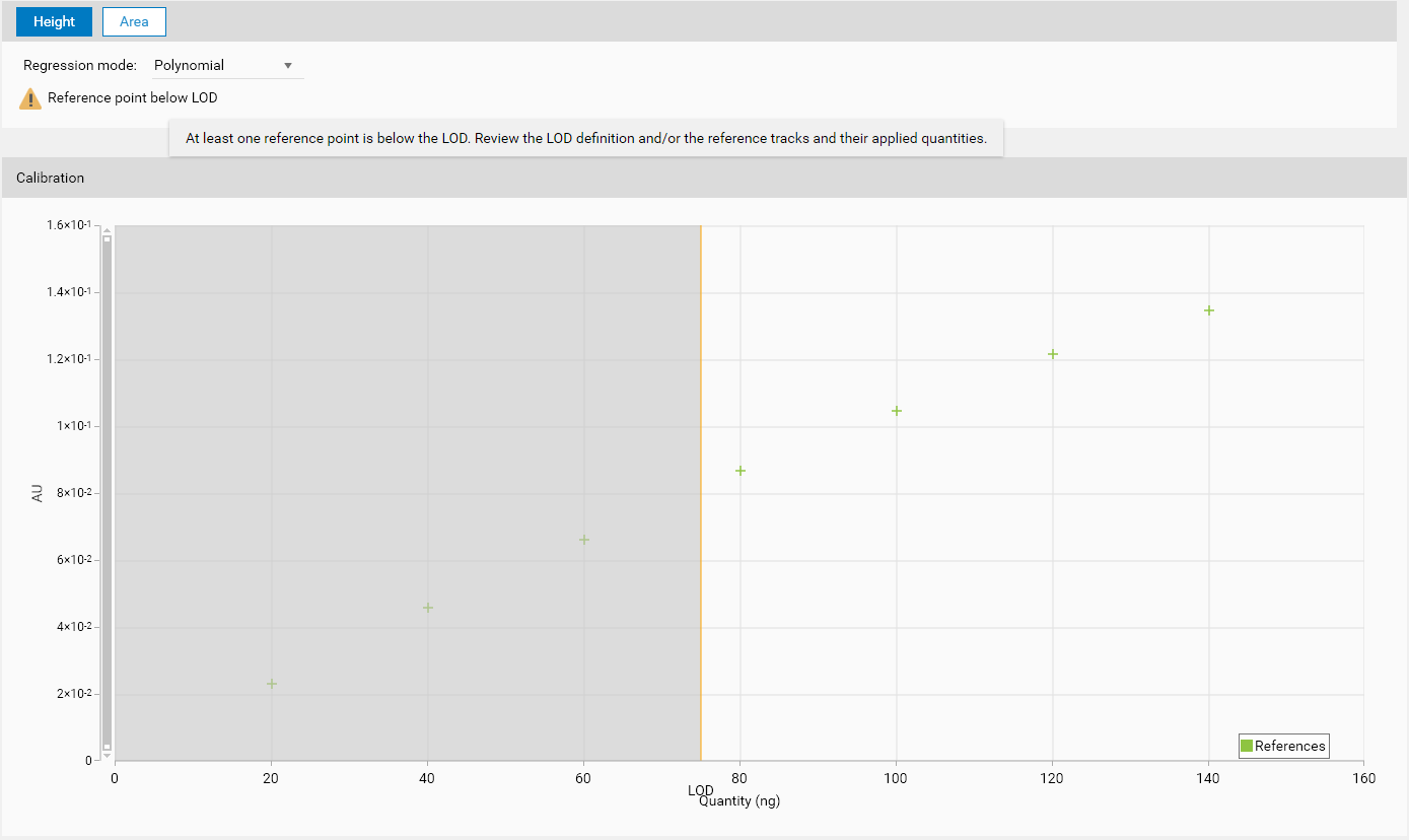 If a Reference calibration point value falls below the LOD, then the whole calibration fails. No regression function is displayed and no sample result can be computed. It is still possible, as a workaround, to manually exclude the corresponding track(s) or remove the corresponding assignment(s).