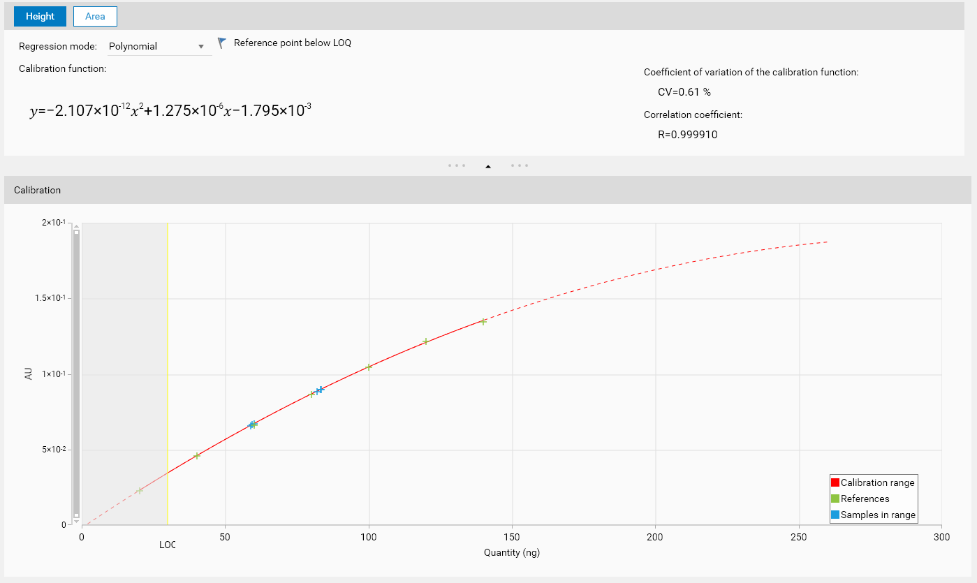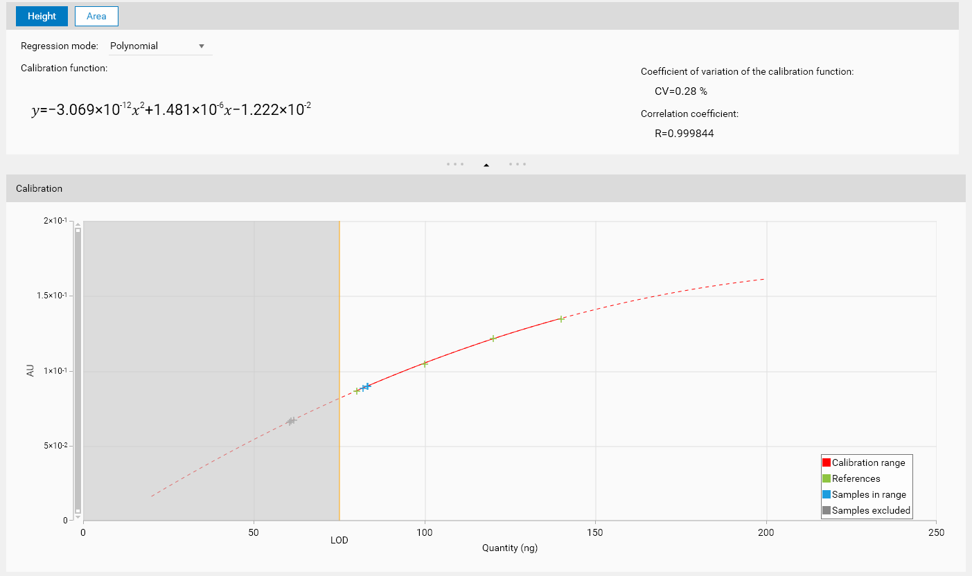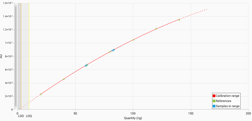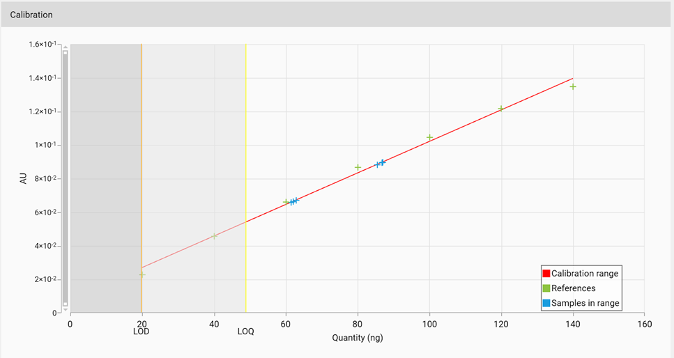 In the Calibration tab, LOD / LOQ values are shown respectively with Orange / Yellow vertical lines and Gray / Light gray areas: