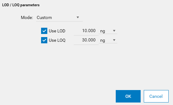 By clicking on the editing button, the LOD / LOQ parameters popup is displayed, where the mode can be changed. In Custom mode, configure whether the LOD and/or the LOQ checks must be performed and set the corresponding quantities:
