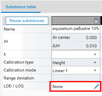 In the Definition tab, when the LOD / LOQ advanced option is activated, the substance table displays the mode for each substance, which is None by default: