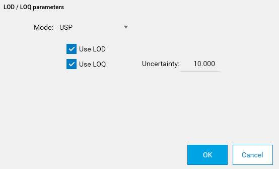 In USP mode, the LOD / LOQ values are determined automatically. The Uncertainty parameter corresponds to the custom factor (usually 10) to apply during the computation of the LOQ :