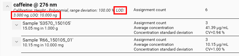 Due to the way LOD / LOQ values are computed with the formula provided by the USP, Linear-2 calibration mode must be used with at least 3 reference points. The computation is performed automatically along with the calibration / results computation. The LOD / LOQ then appear exactly like in the Custom mode in the Calibration tab. Go to the Results tab to display the LOD / LOQ values computed by the formula: