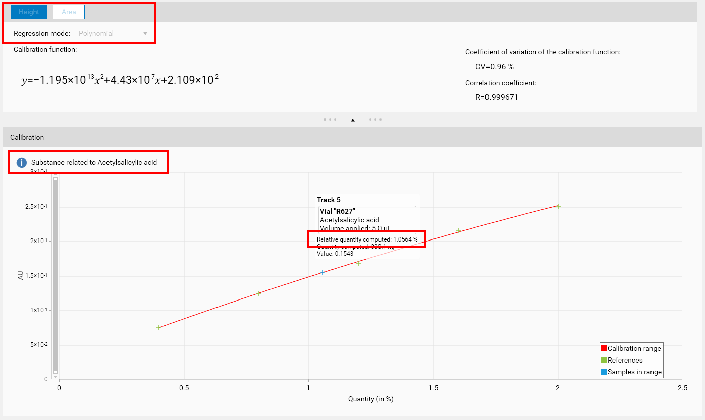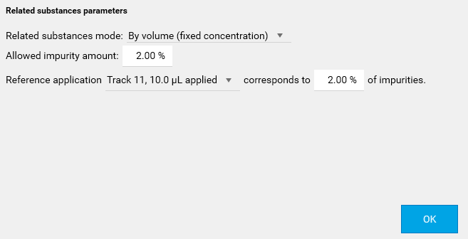 Default: this is the simplest and the most generic mode, already present in winCATS, where only the substitution of the calibration curve is done for each related substance. This mode offers the most freedom but gives only the normal results of the quantification. The 2 other modes include the Allowed impurity amount field which enables the computation of the sum of impurities for each track.