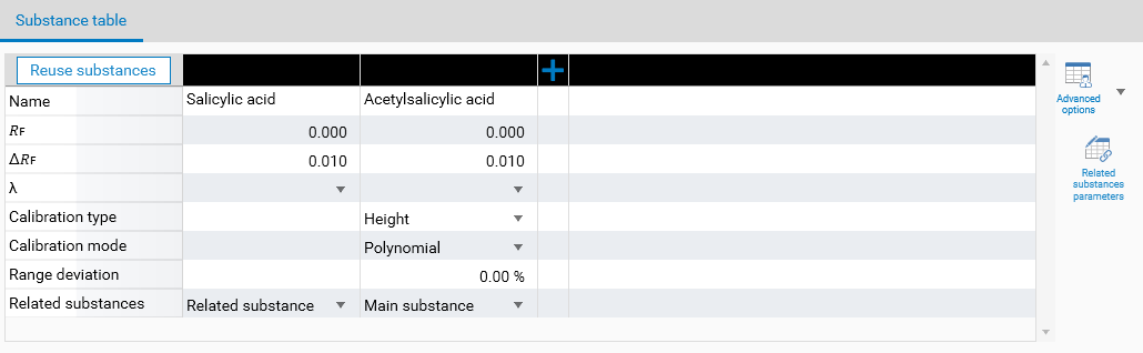 In Definition tab of the evaluation, use the Advanced options button to make the Related substances field appear. In an evaluation, there can be only one Main substance, other substances can be of type Related substances or None (no related substance). Of course, the functionality will only work if the main substance and at least one related substance are defined. Because the related substances use the calibration curve of the main substance, the calibration-related fields are hidden for related substances.