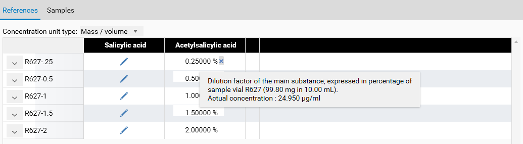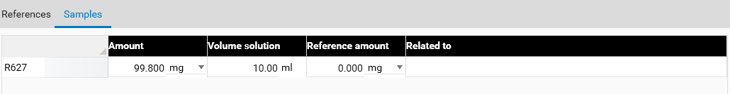 The Amount and Volume solution fields give a reference concentration, and the volume applied has to be the same for all applications of this sample, therefore, there’s a reference quantity too, which will be used when computing the results of the evaluation. In the References section, once the reference concentration is defined, the dilution factor can be directly entered instead of the concentration, and the tooltip explains the correspondence between the dilution factor and the actual concentration: