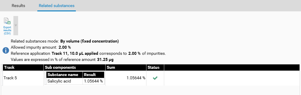 In the Results tab, the results are not displayed for the main substance of the evaluation. When the By dilution or the By volume mode is selected, a Related substances tab appears. It displays, for each track, the details of the related substances percentages. In order to confirm that the related substances are impurities, the Status field indicates whether some tracks exceed the allowed impurity amount.