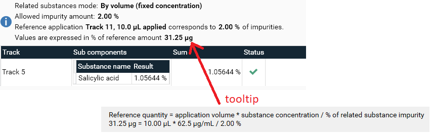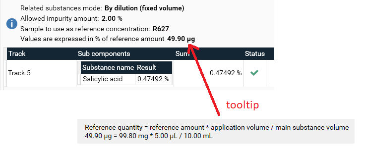 The result of the computation of reference amount is displayed and the details is explained into a tooltip: