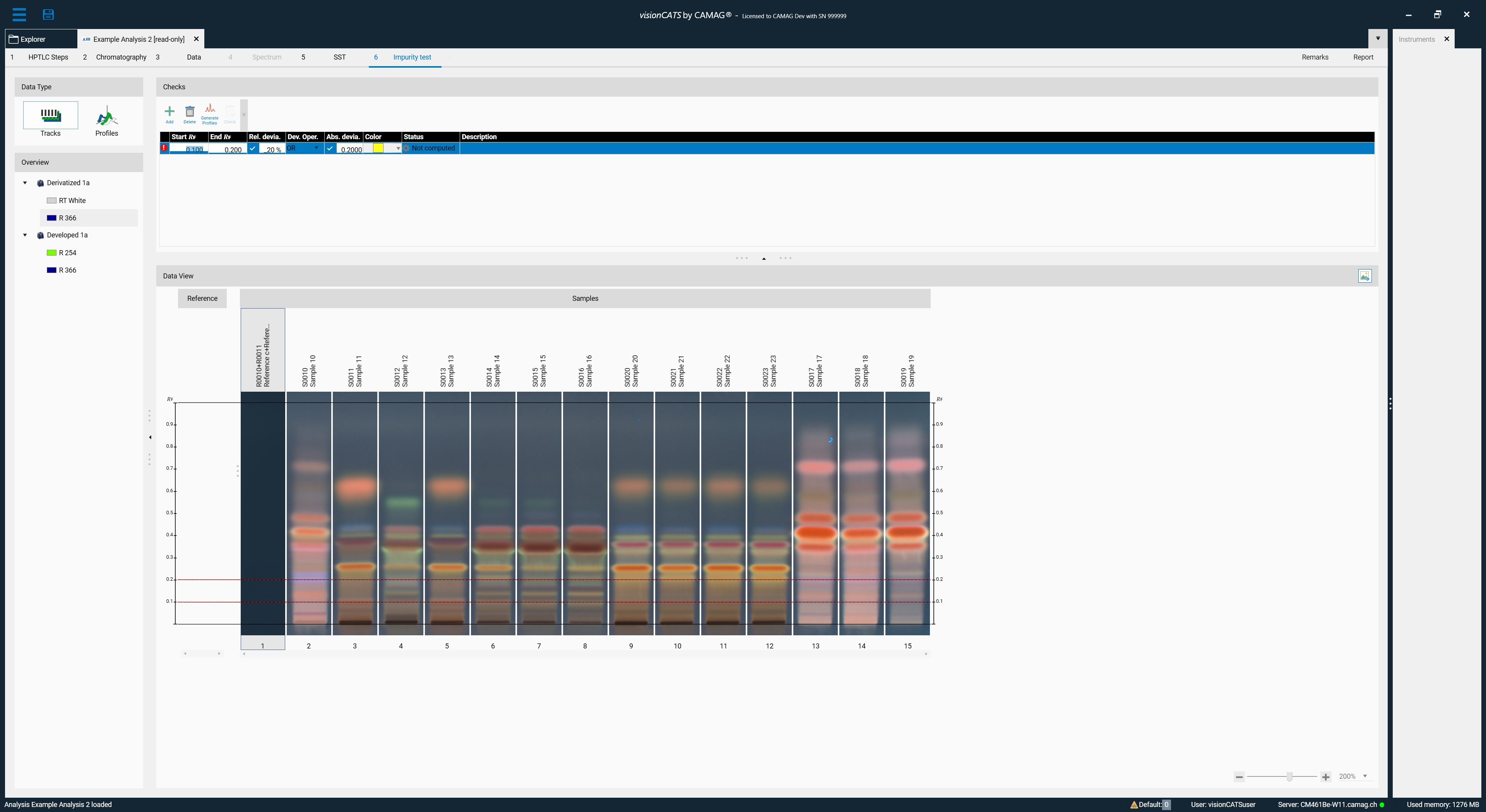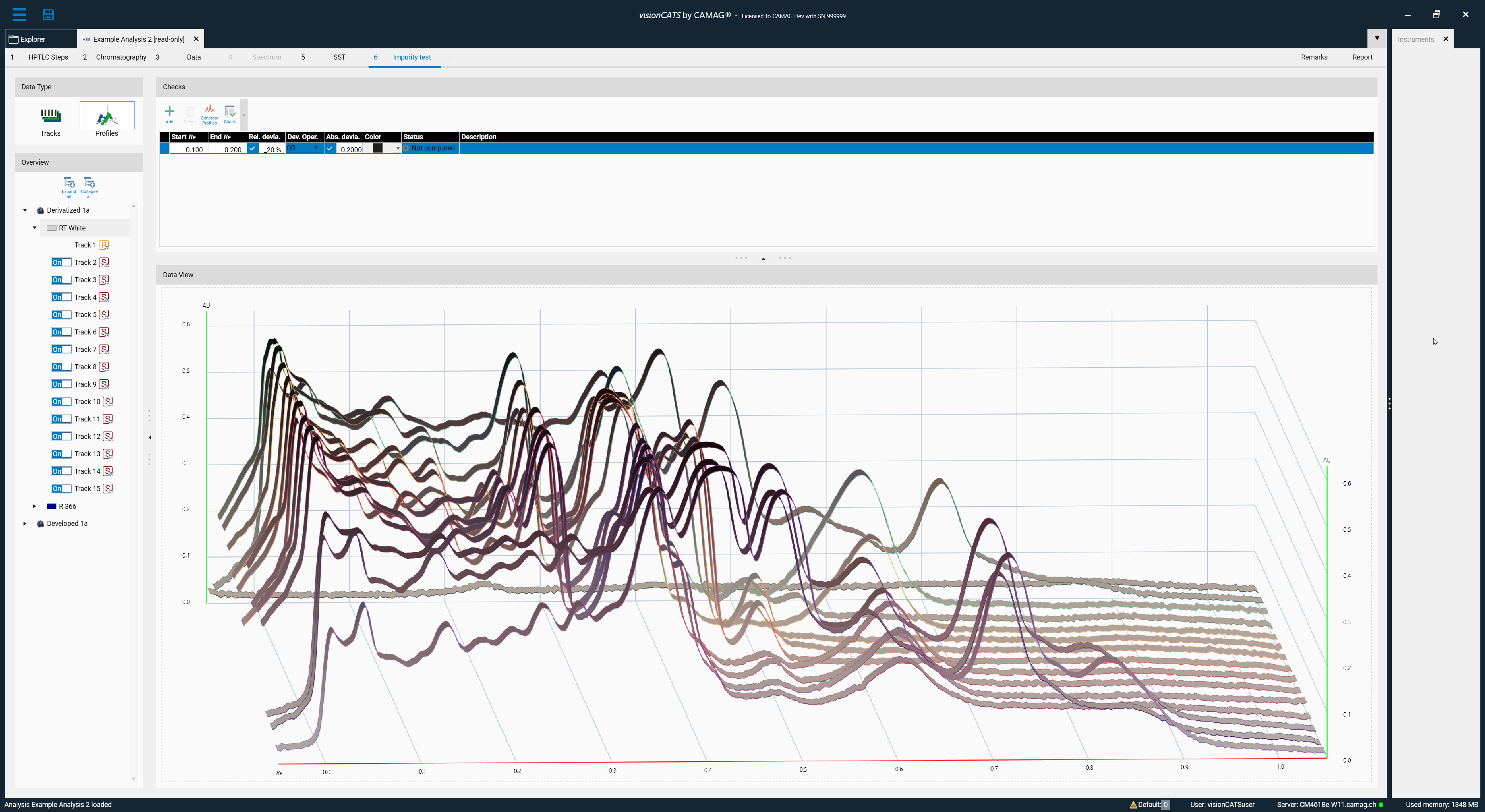 The profiles view can be used to test the impurity of the tracks processed by a TLC Visualizer or a TLC Scanner: