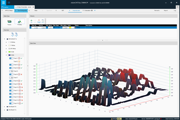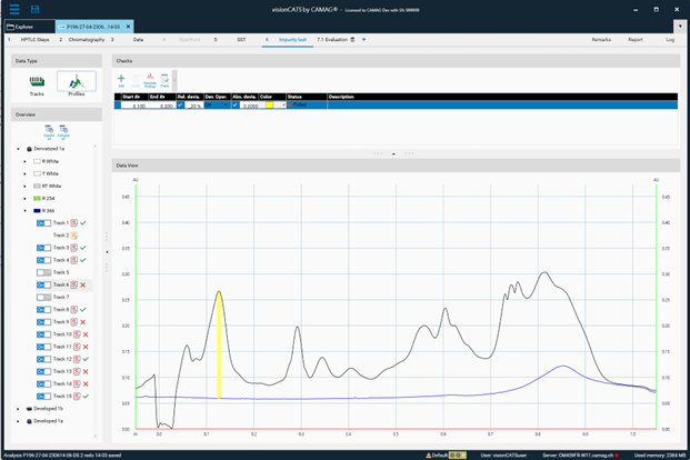 The profiles view can be used to test the impurity of the tracks processed by a TLC Visualizer or a TLC Scanner.